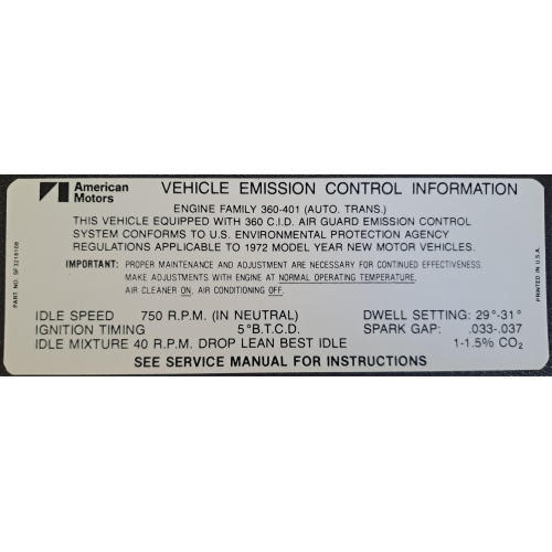 1972 MODELS WITH 360 V8 AND AUTOMATIC TRANSMISSION EXCEPT THOSE WITH THE CALIFORNIA EMISSIONS PACKAGE, THIS IS THE ENGINE COMPARTMENT EMISSIONS DECAL.