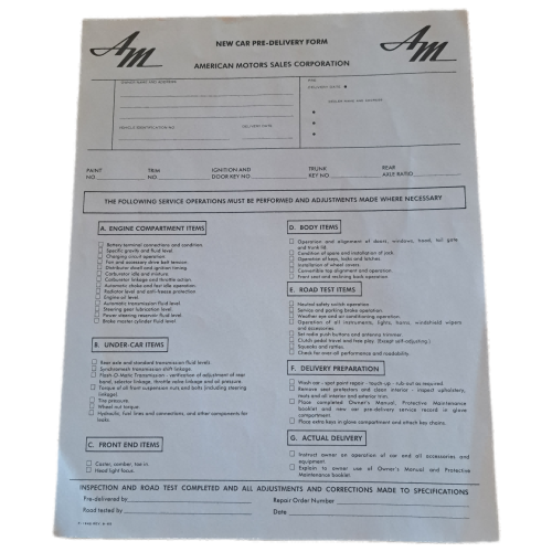 1966-68 DEALER NEW CAR PREPARATION SHEET.
